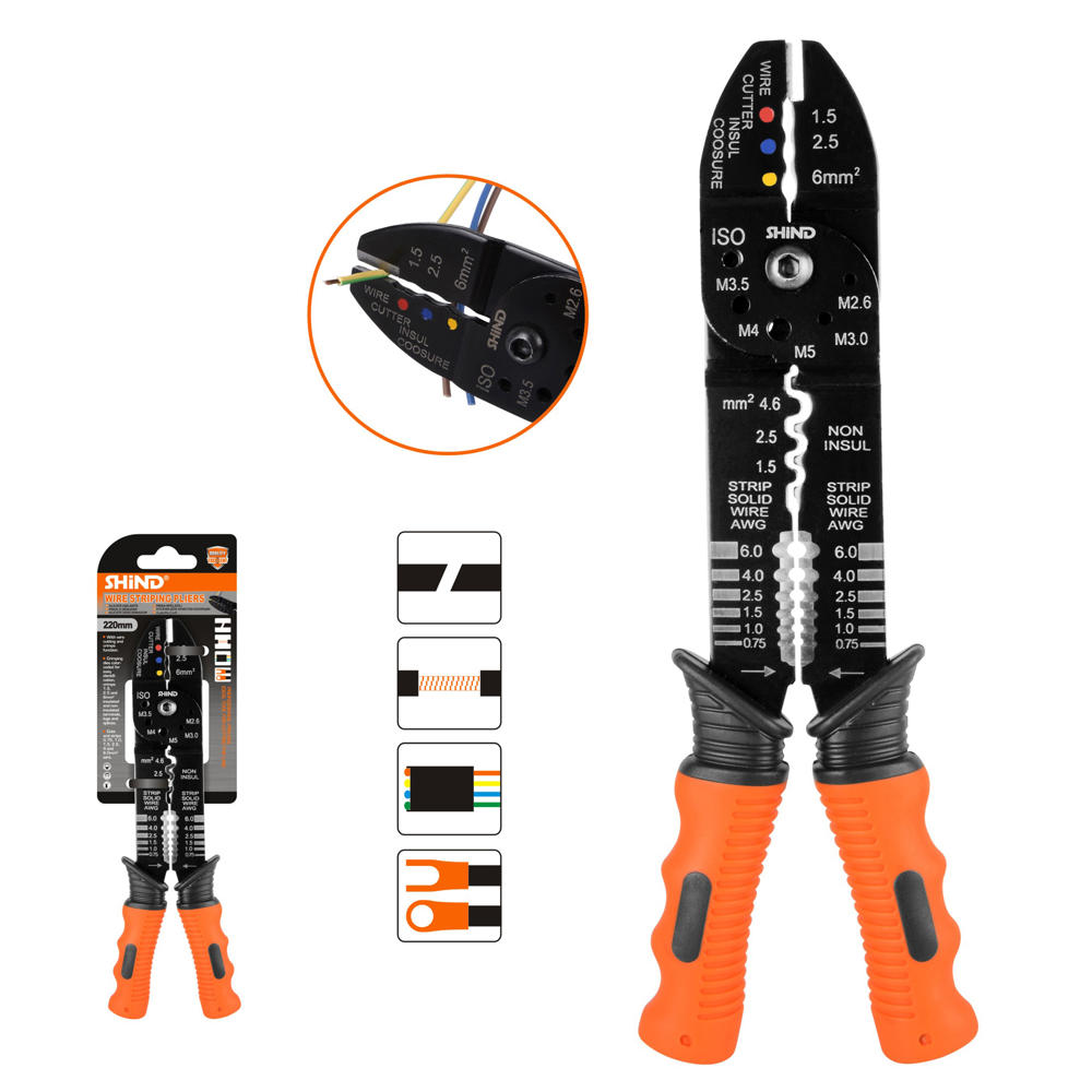 Εργαλείο 2 σε 1 για πρέσα ακροδεκτών και απογύμνωση καλωδίων, μήκους 220mm, με εργονομική λαβή και ανθεκτική κατασκευή.